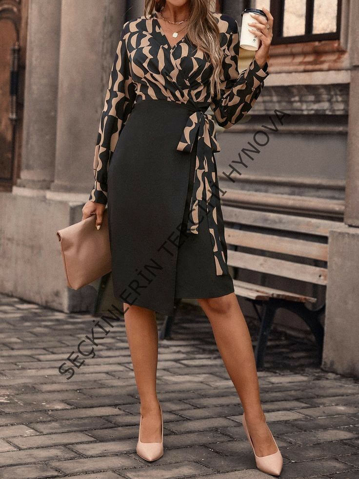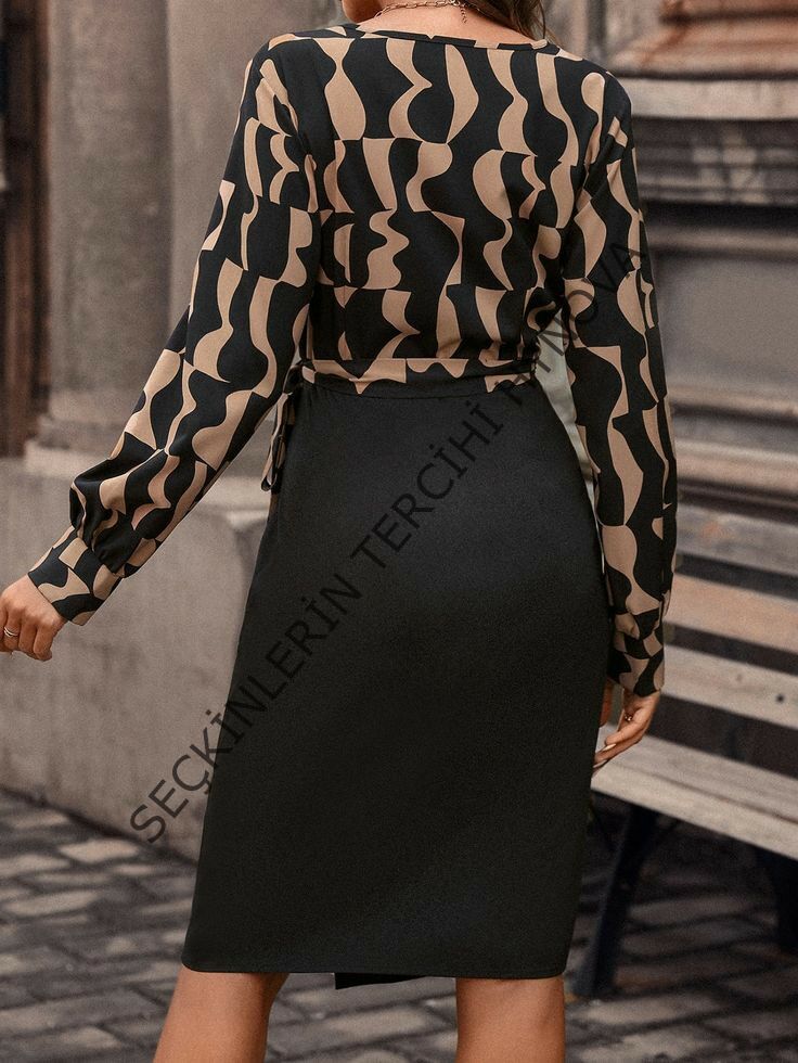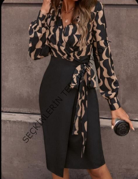 Kadın Uzun Kollu Kruvaze Yaka Dijital Baskılı Fiyonk Detay Atlas Kumaş Elbise