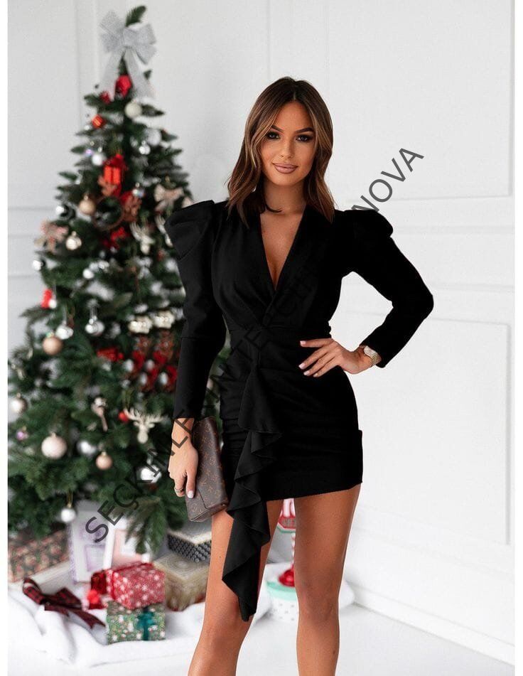 Kadın Uzun Kollu Kruvaze Yaka Karpuz Kol Eteği Fırfır Detay Krep Mini Elbise