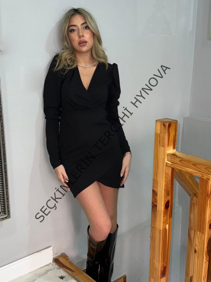 Kadın Uzun Kollu Kruvaze Yaka Kol Detaylı Ithal Krep Mini Elbise