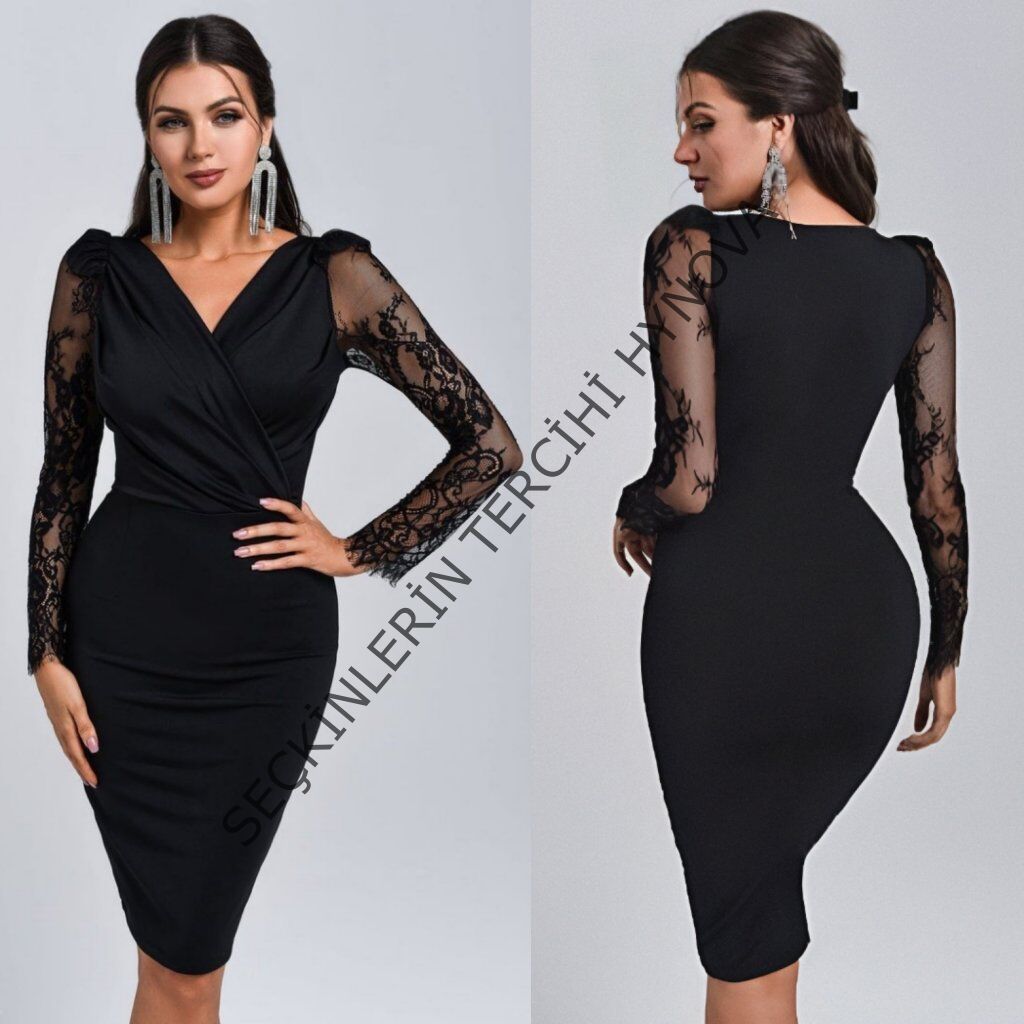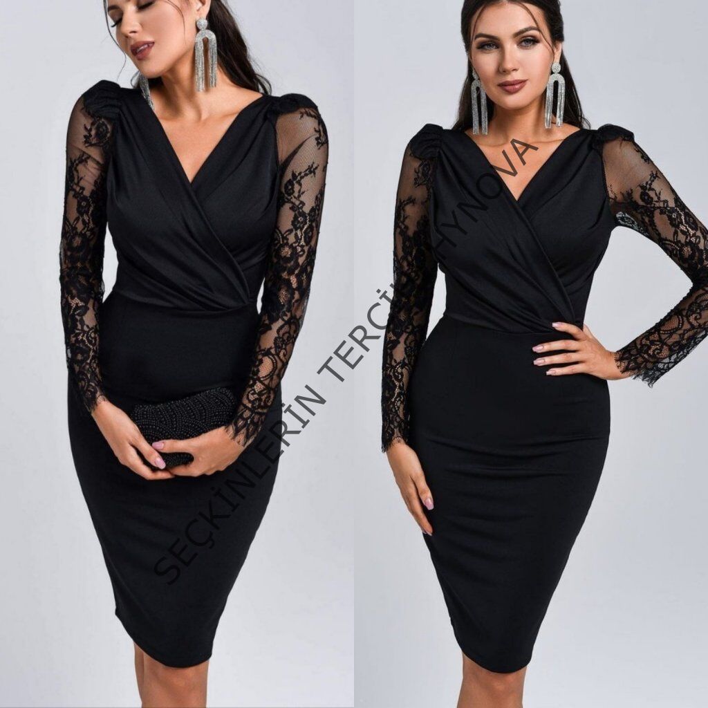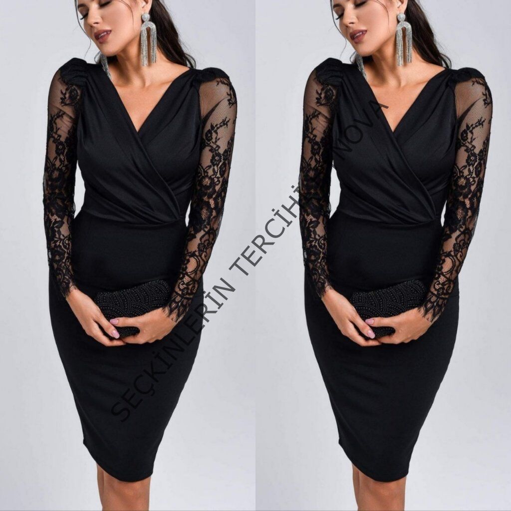 Kadın Uzun Kollu Kruvaze Yaka Kollar Tül Detay Krep Mini Boy Elbise