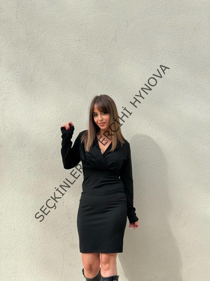 Kadın Uzun Kollu Kruvaze Yaka Krep Mini Boy Elbise