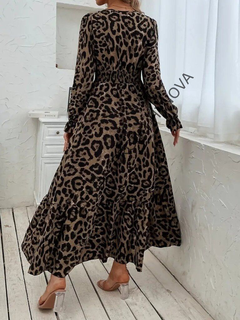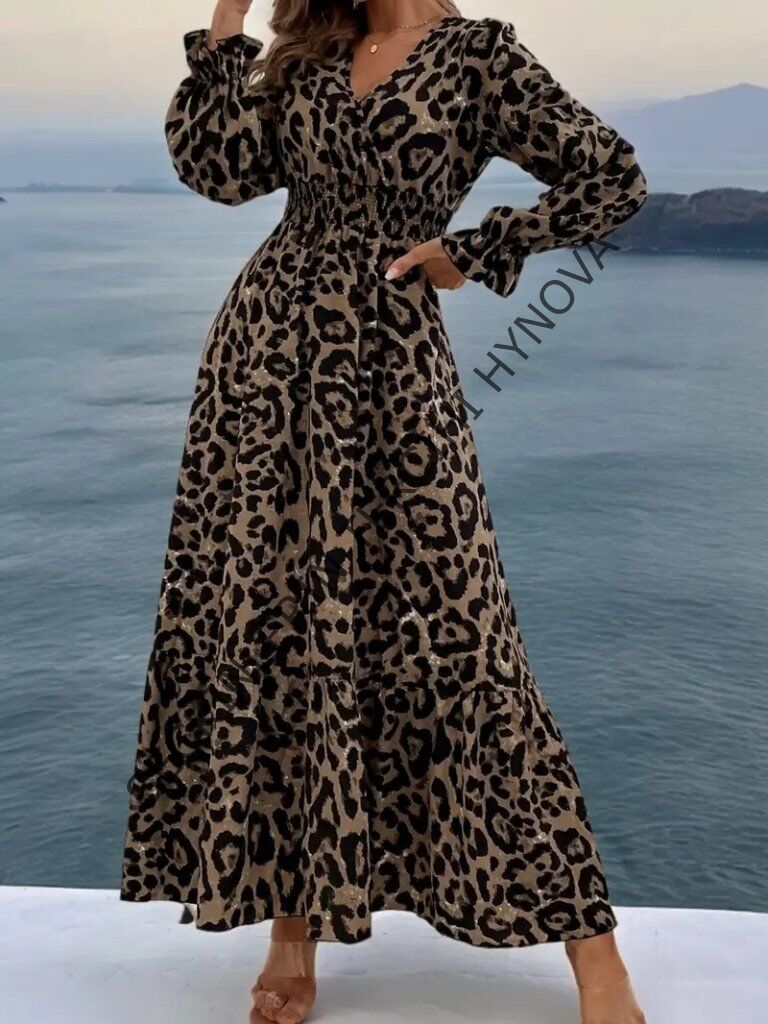 Kadın Uzun Kollu Kruvaze Yaka Leopar Desenli Uzun Süprem Elbise