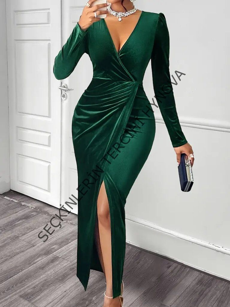 Kadın Uzun Kollu Kruvaze Yaka önünden çapraz Detaylı Uzun Kadife Elbise