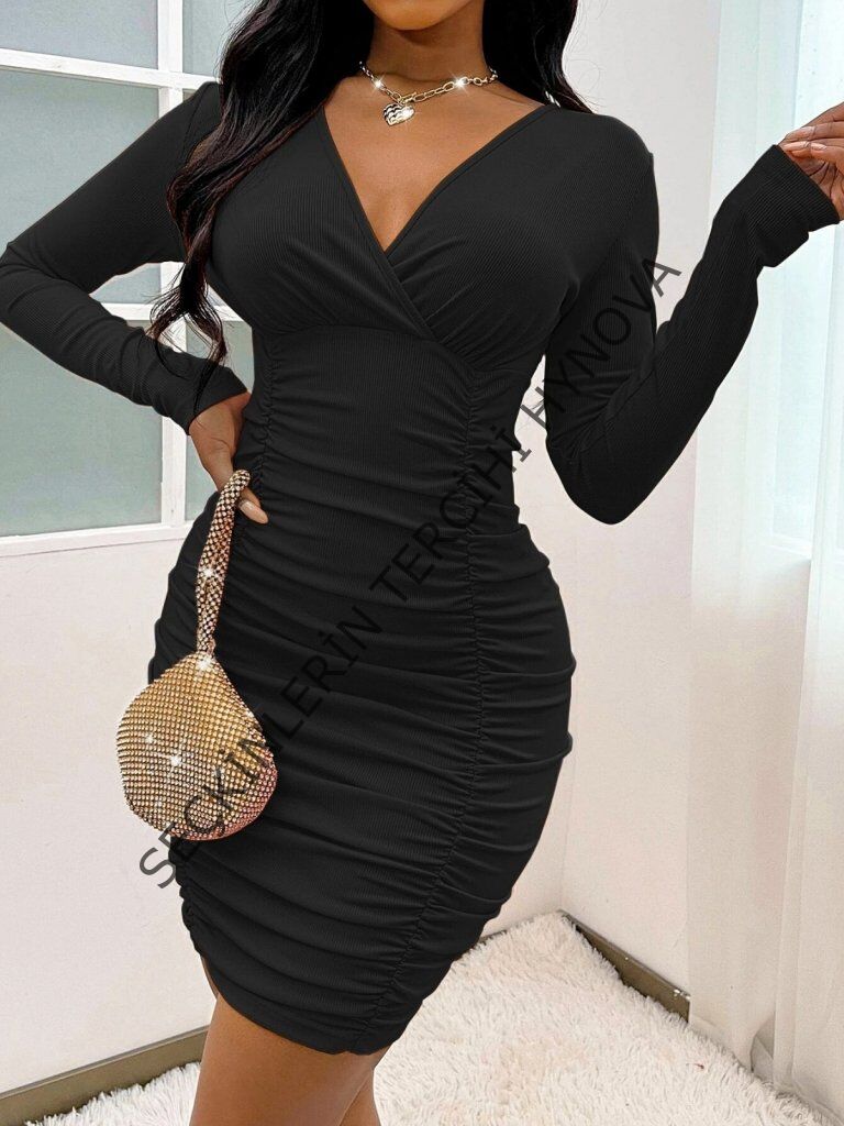 Kadın Uzun Kollu Kruvaze Yaka Sandy Mini Elbise
