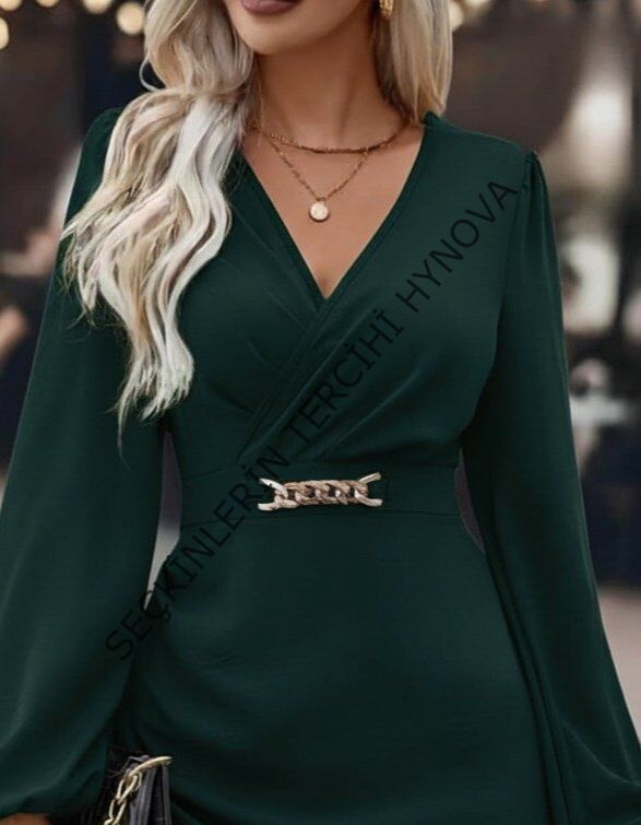 Kadın Uzun Kollu Kruvaze Yaka Yandan Büzgülü Asimetrik Detaylı Ithal Krep Mini Elbise