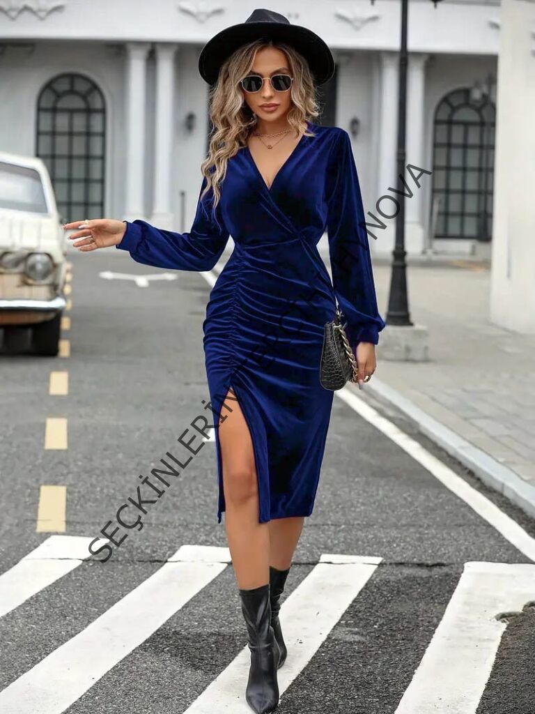 Kadın Uzun Kollu Kruvaze Yaka Yanlardan Büzgü Detaylı Yırtmaçlı Kadife Elbise