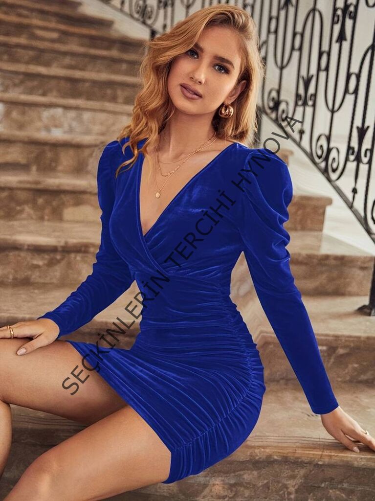 Kadın Uzun Kollu Kruvaze Yaka Yanlardan Büzgülü Kadife Elbise