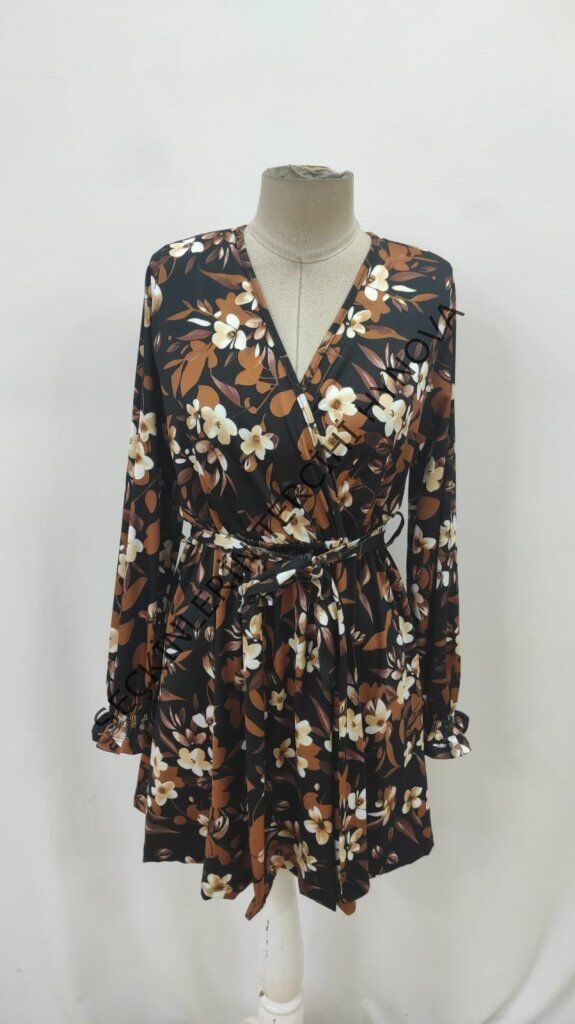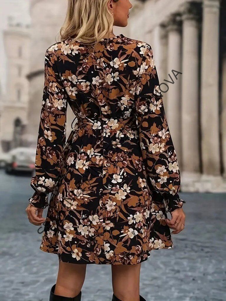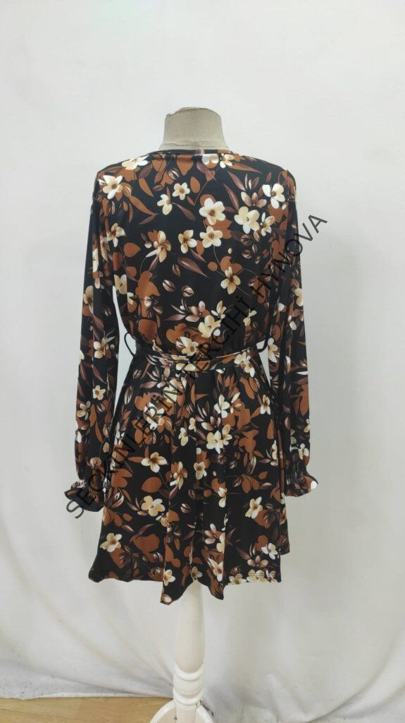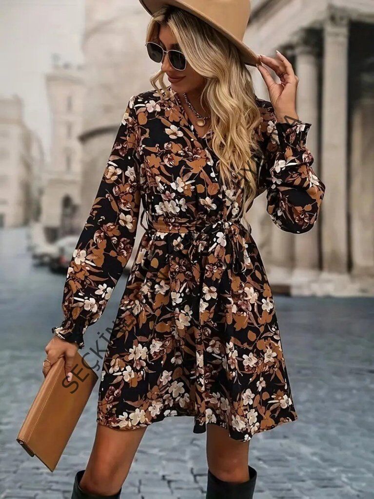 Kadın Uzun Kollu Kruvaze Yakalı Belden Kuşaklı çiçek Desenli Mikro Süprem Mini Elbise