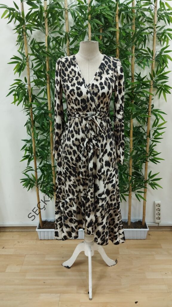 Kadın Uzun Kollu Kruvaze Yakalı Belden Kuşaklı Leopar