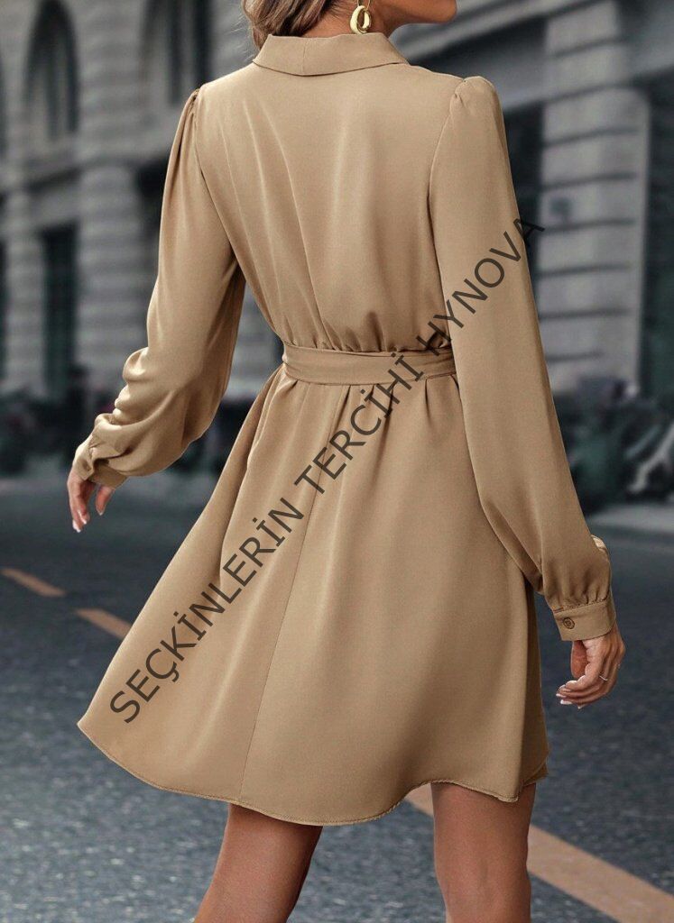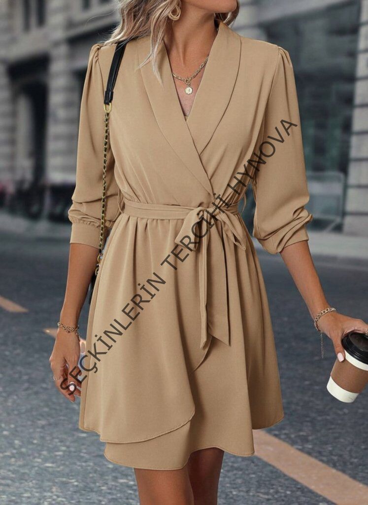 Kadın Uzun Kollu Kruvaze Yakalı Belden Kuşaklı Mini çift Katlı Ithal Krep Elbise