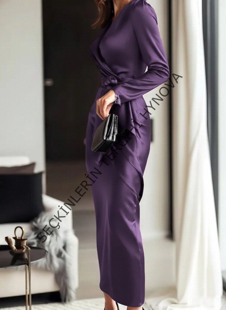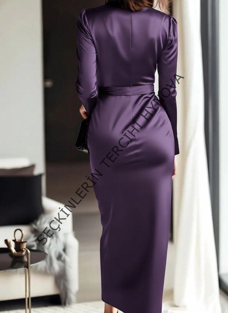 Kadın Uzun Kollu Kruvaze Yakalı Beli Kuşaklı Uzun Saten Elbise