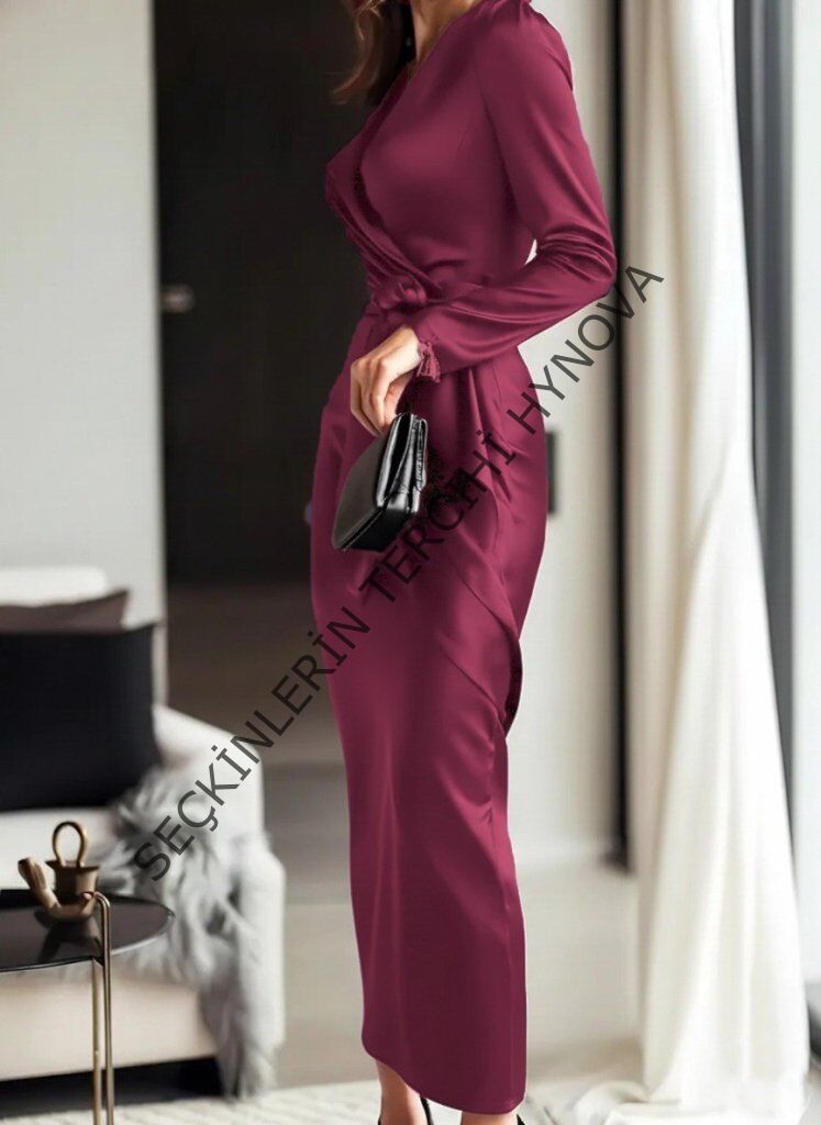 Kadın Uzun Kollu Kruvaze Yakalı Beli Kuşaklı Uzun Saten Elbise