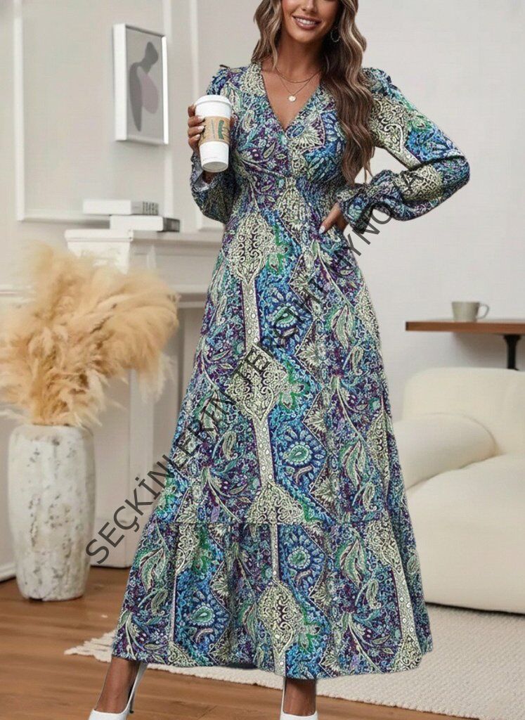 Kadın Uzun Kollu Kruvaze Yakalı Desenli Süprem Maxi Elbise