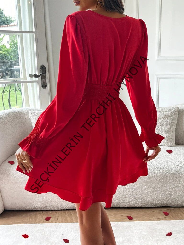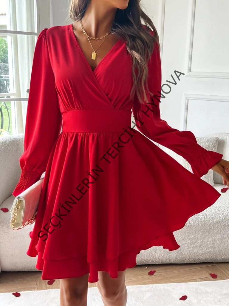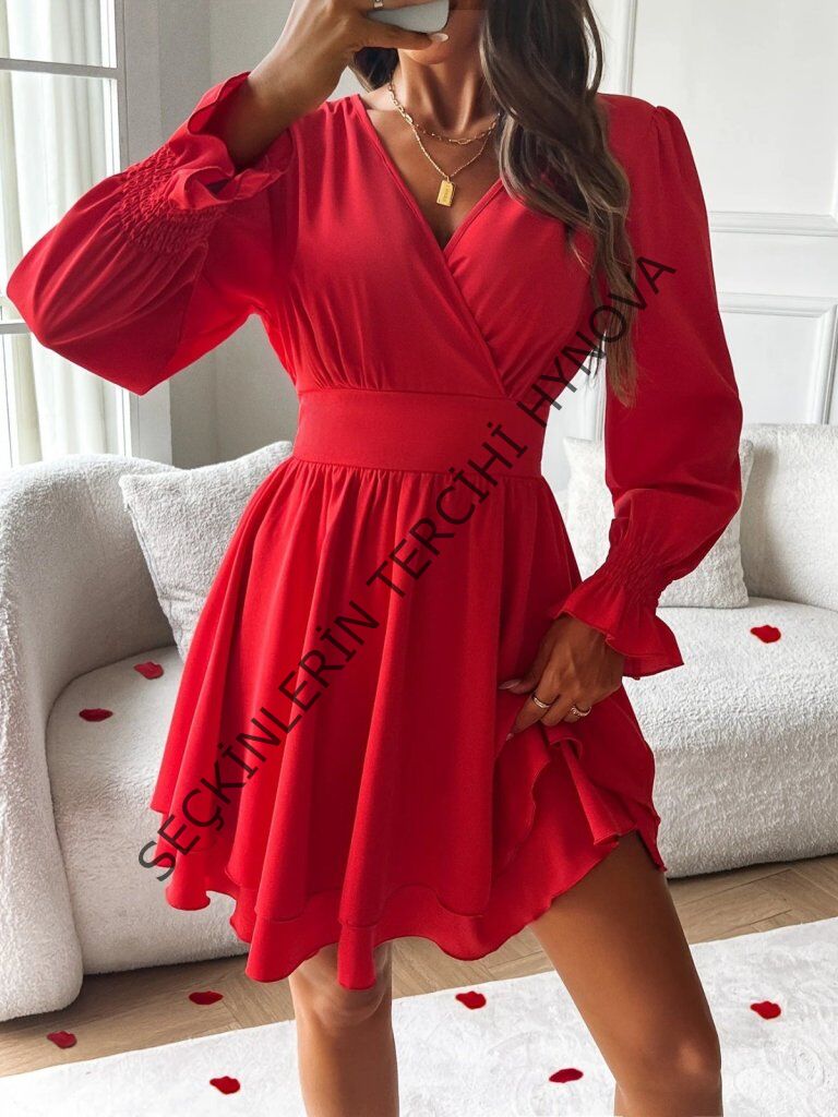 Kadın Uzun Kollu Kruvaze Yakalı Mini Sandy Elbise