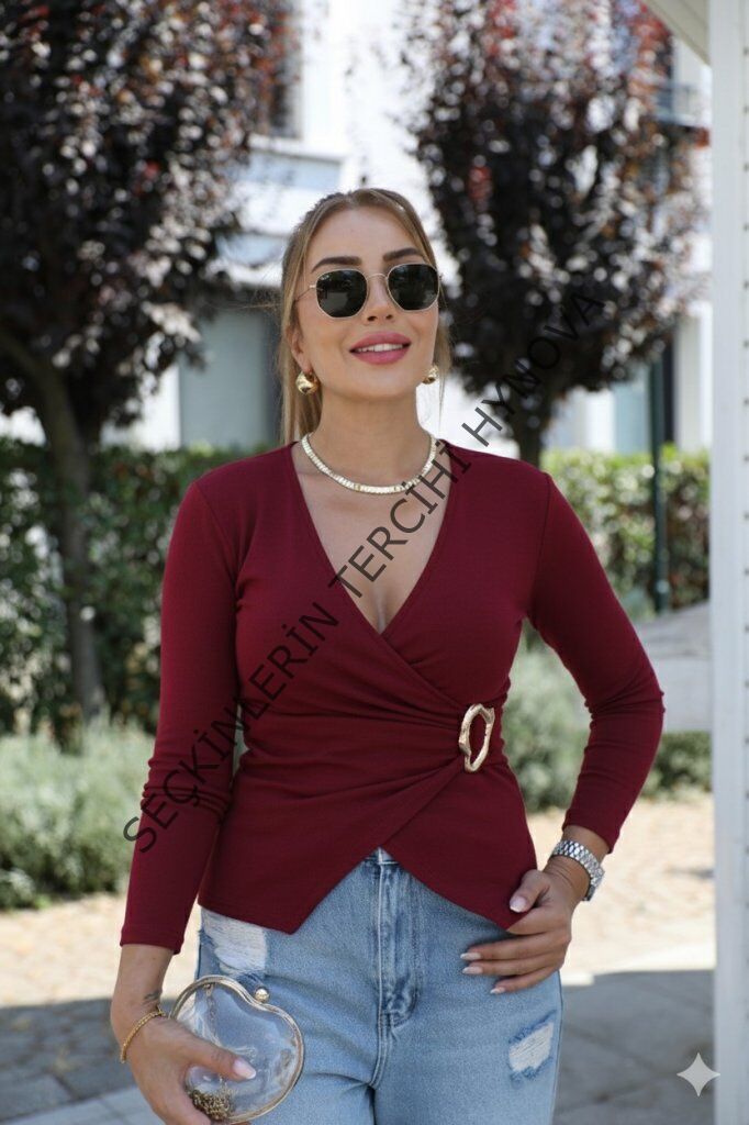 Kadın Uzun Kollu Kruvaze Yakalı Toka Detaylı Viskon Bluz