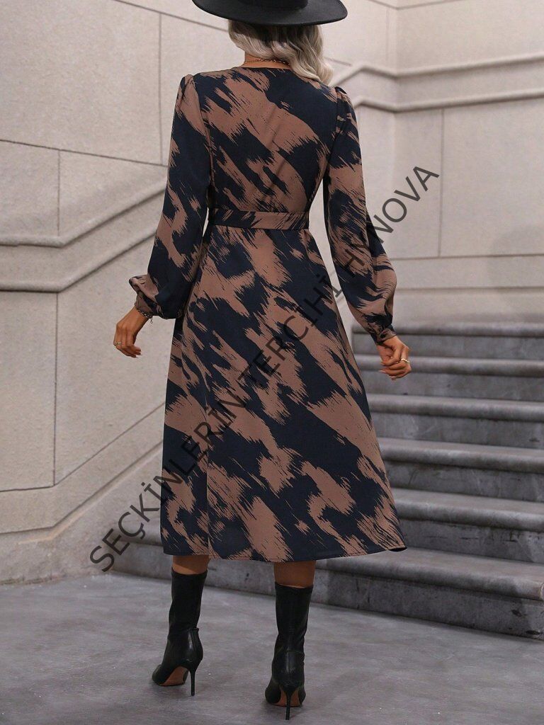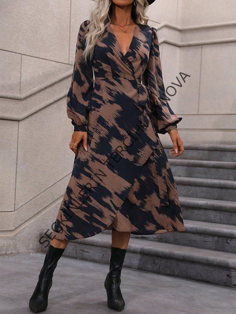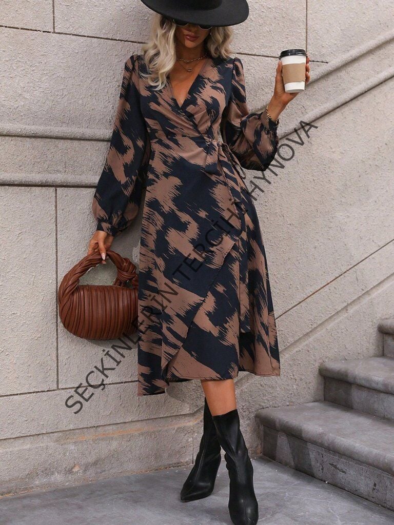 Kadın Uzun Kollu Kruvaze Yakalı Yandan Bağlamalı Desenli Mini Modal Elbise