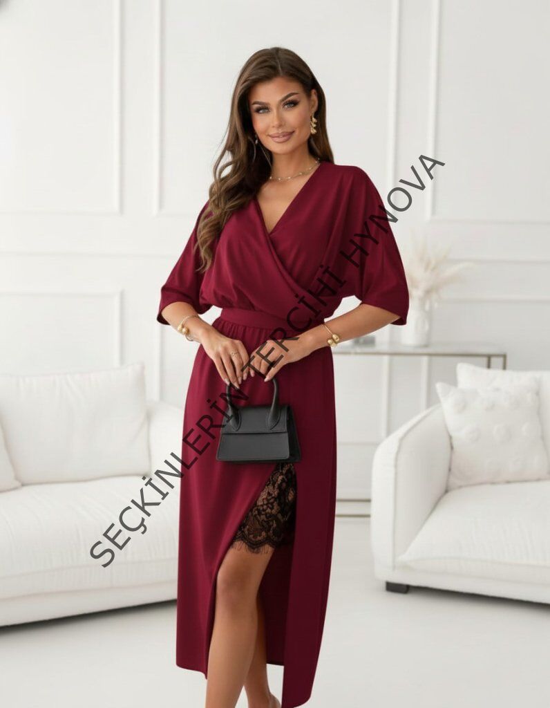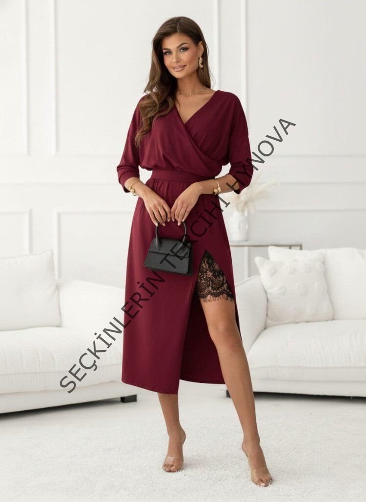 Kadın Uzun Kollu Kruvaze Yakalı Yandan Dantelli Midi Ithal Krep Elbise