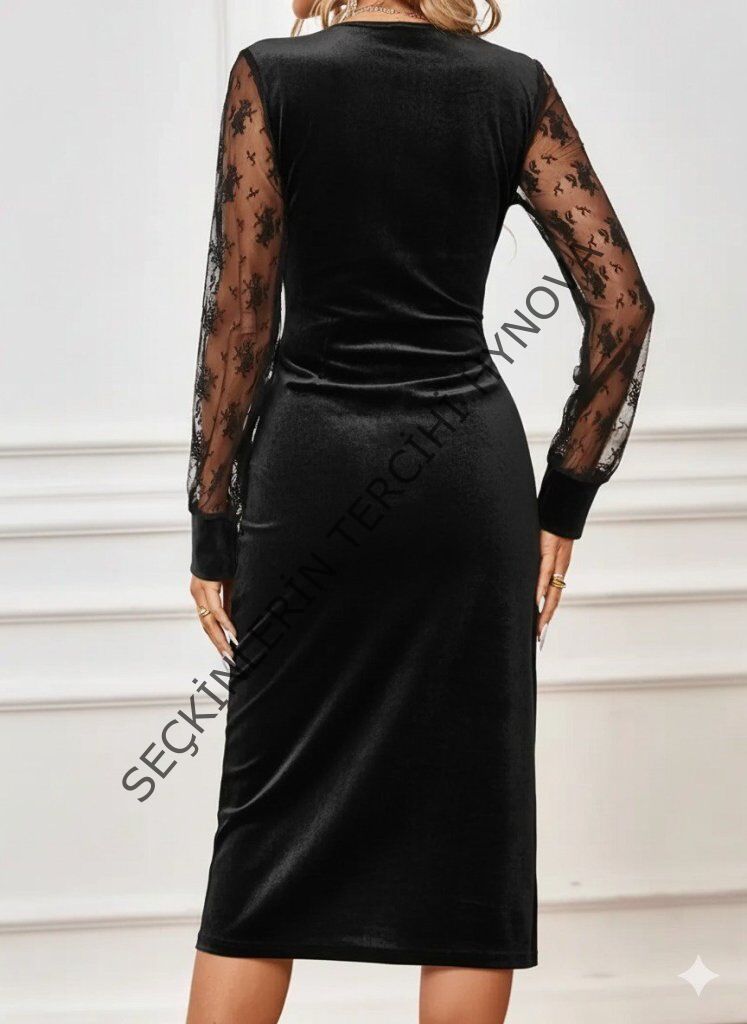 Kadın Uzun Kollu Kruvaze Yakalı Yandan Düğmeli önden çapraz Kesin Detaylı Midi Kadife Elbise