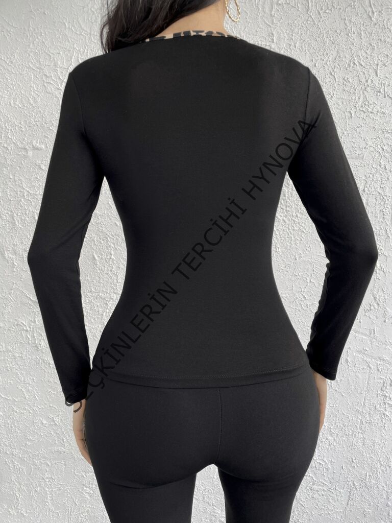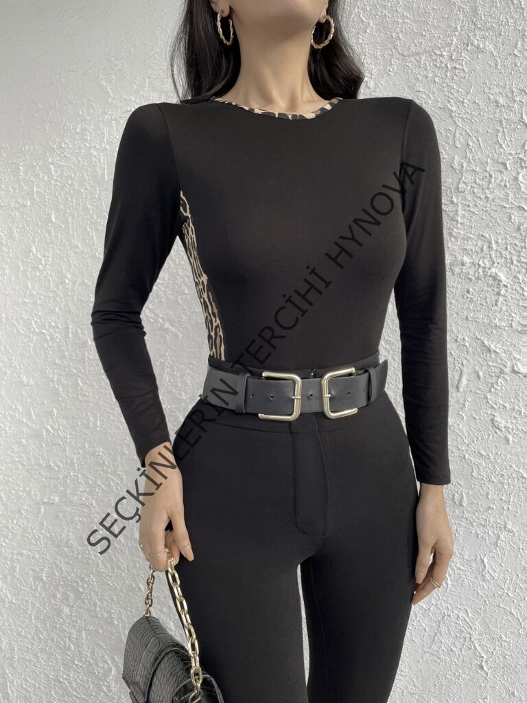 Kadın Uzun Kollu Leopar şeritli Viskon Bluz