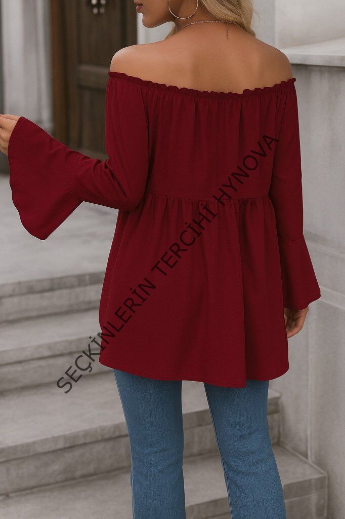 Kadın Uzun Kollu Madonna Yaka Asimetrik Detaylı Kolları Ispanyol Viskon Bluz
