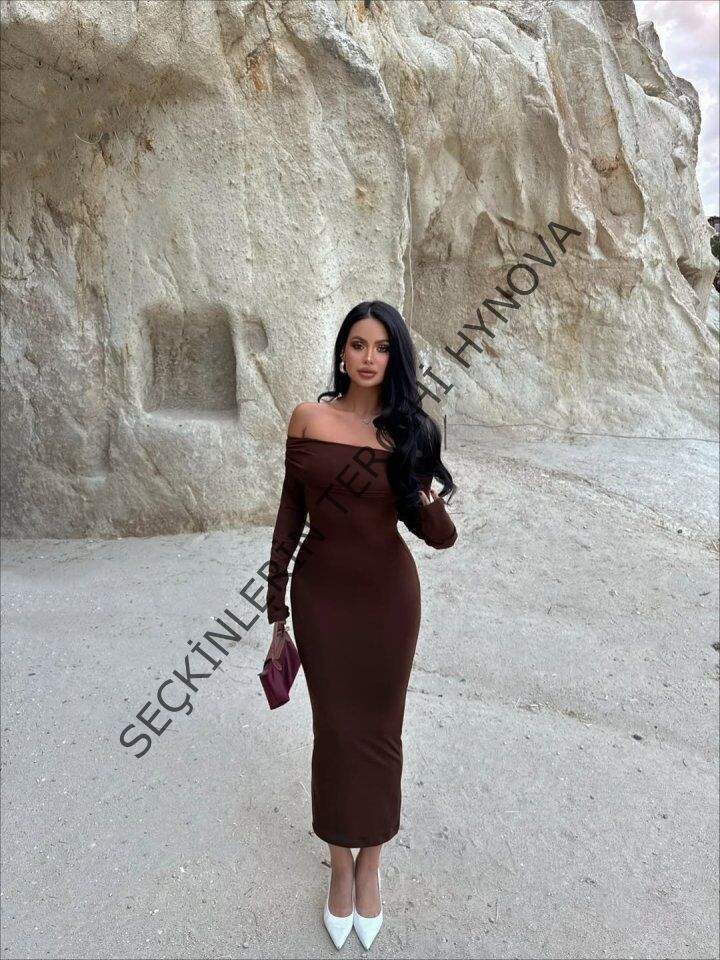 Kadın Uzun Kollu Madonna Yaka Midi Boy Elbise