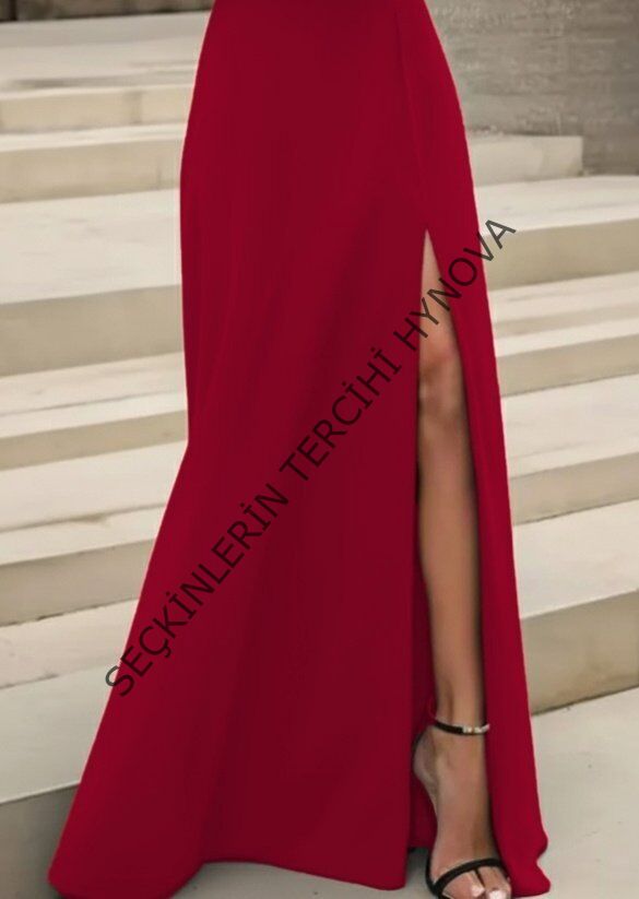Kadın Uzun Kollu Madonna Yakalı Yırtmaç Detaylı Uzun Ithal Krep Elbise