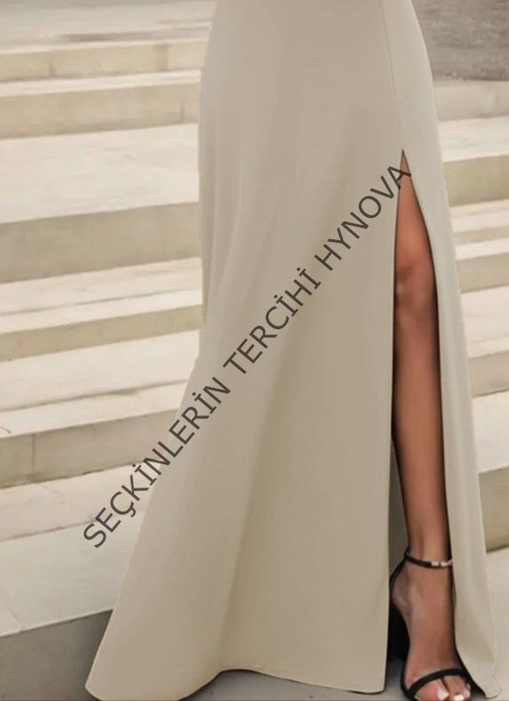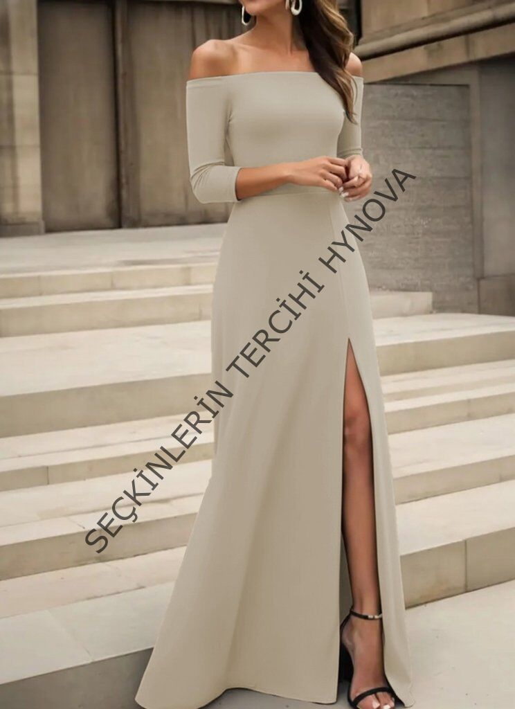 Kadın Uzun Kollu Madonna Yakalı Yırtmaç Detaylı Uzun Ithal Krep Elbise