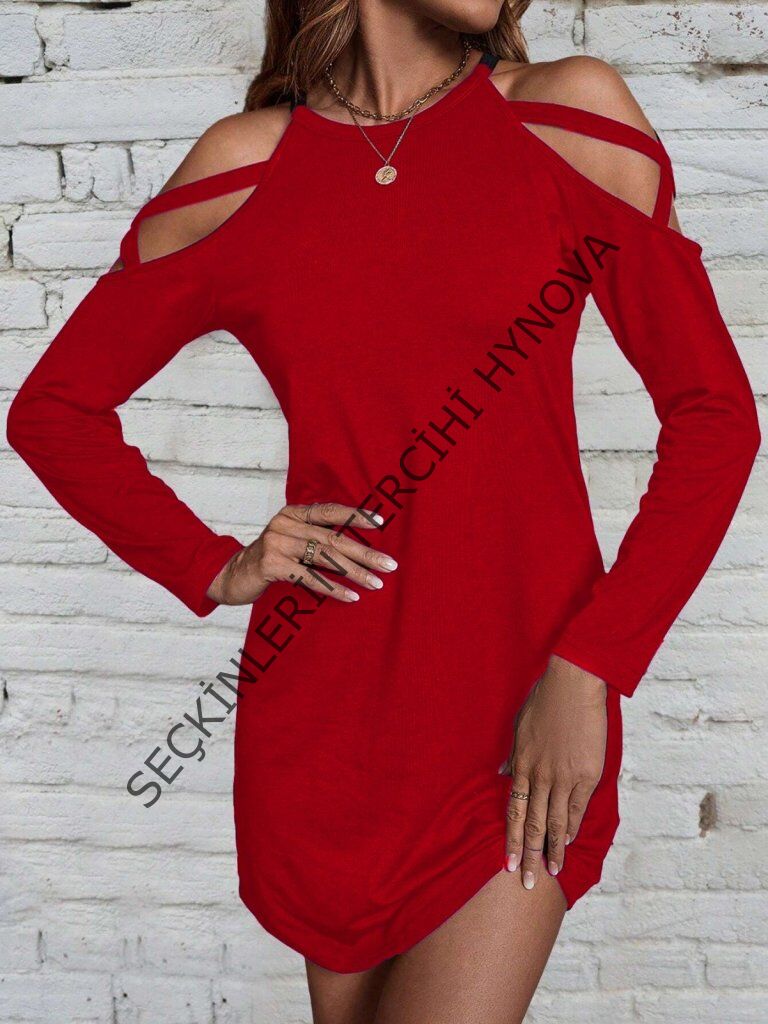 Kadın Uzun Kollu Omuz Açık Askı Detay Viskon Mini Boy Elbise