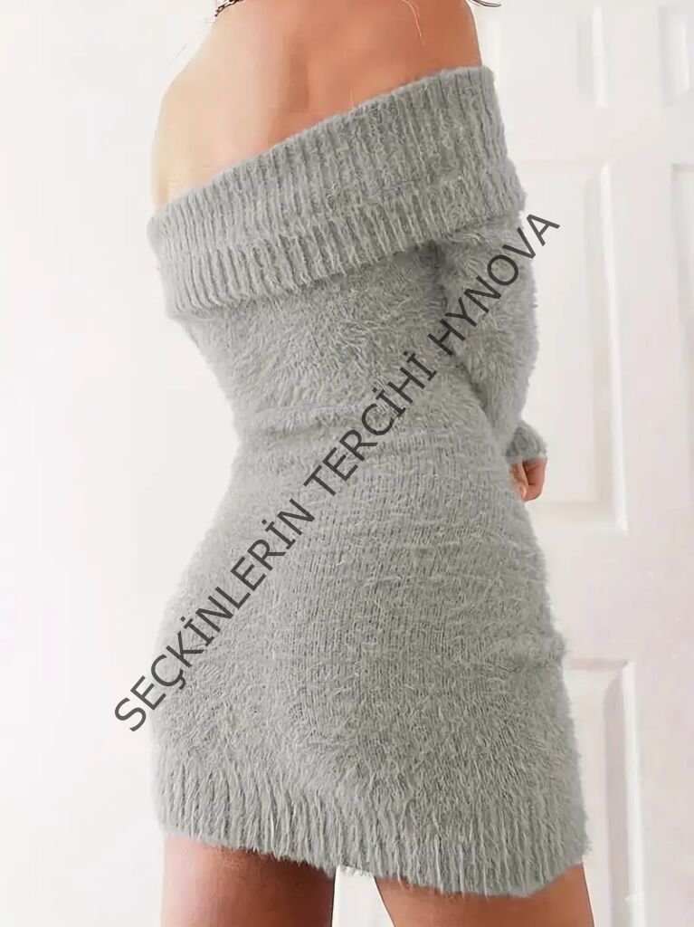 Kadın Uzun Kollu Omuzlardan Açık Kısa şardonlu Triko Elbise