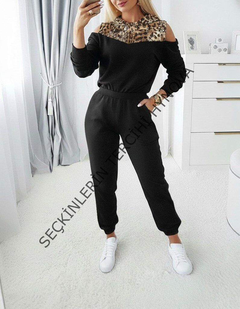 Kadın Uzun Kollu Omuzlardan Açık Leopar Desenli Kapşonlu Viskon Iki Iplik Bluz Ve Pantolon Ikili Takım