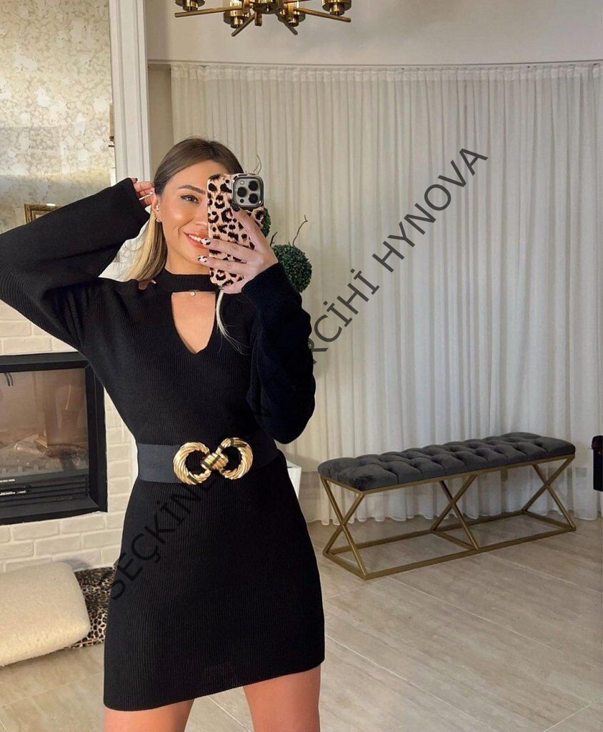Kadın Uzun Kollu Omuzları Açık Boyundan şerit Detay Kaşkorse Elbise