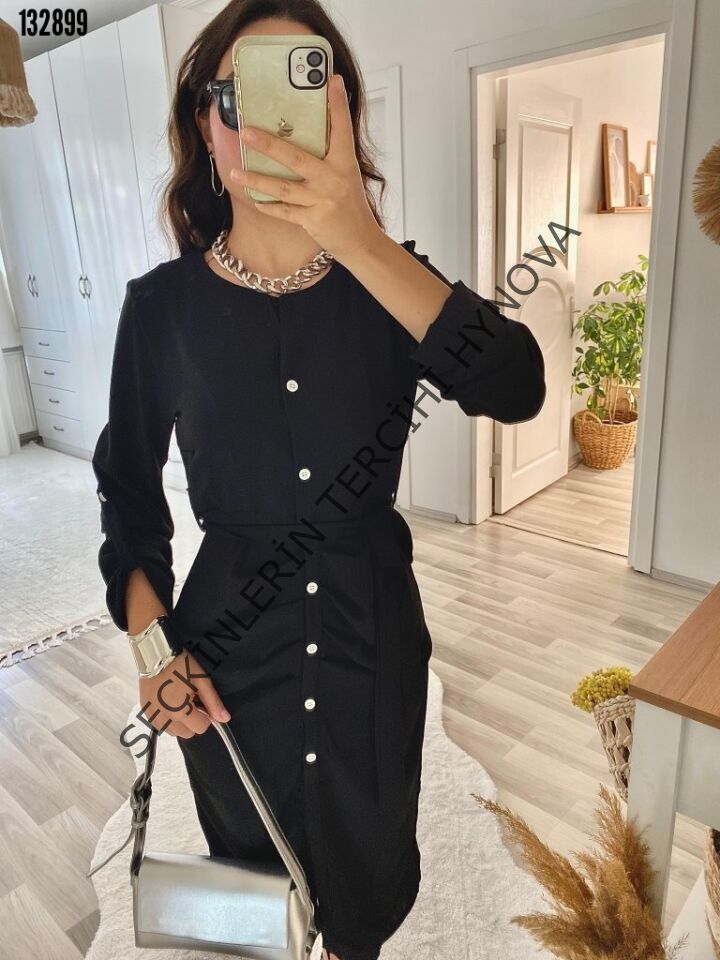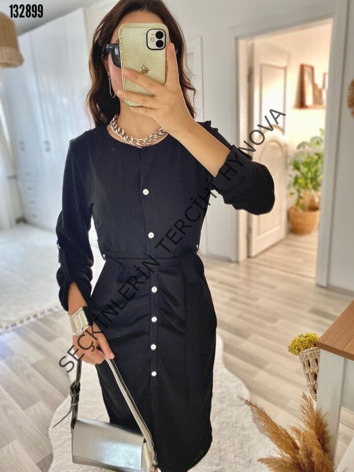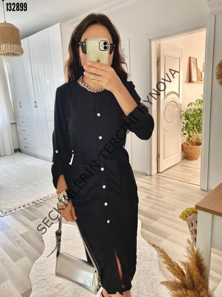 Kadın Uzun Kollu önden Düğmeli Beli Kuşaklı Aerobin Midi Elbise