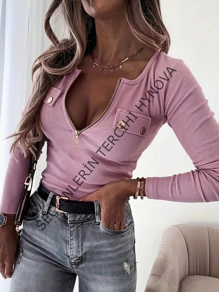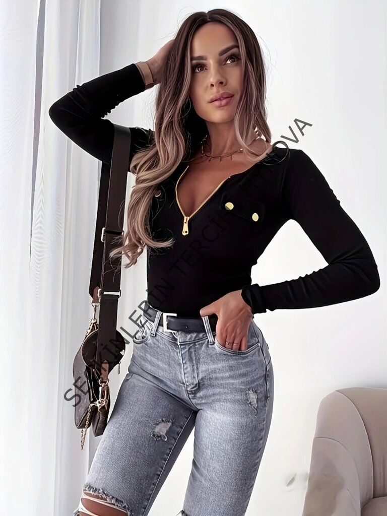 Kadın Uzun Kollu önden Fermuar Ve Cepli Kaşkorse Bluz