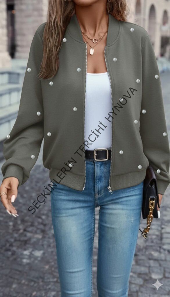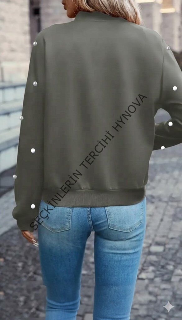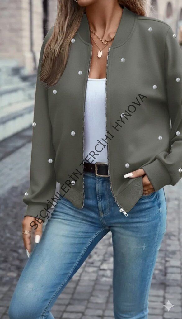 Kadın Uzun Kollu önden Fermuarlı Incili Kısa Modal Ceket