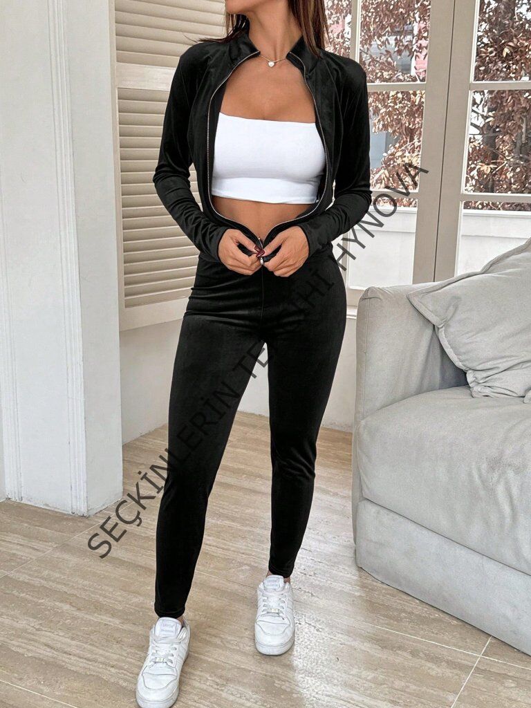 Kadın Uzun Kollu önden Fermuarlı Kadife Bluz Ve Pantolon Ikili Takım