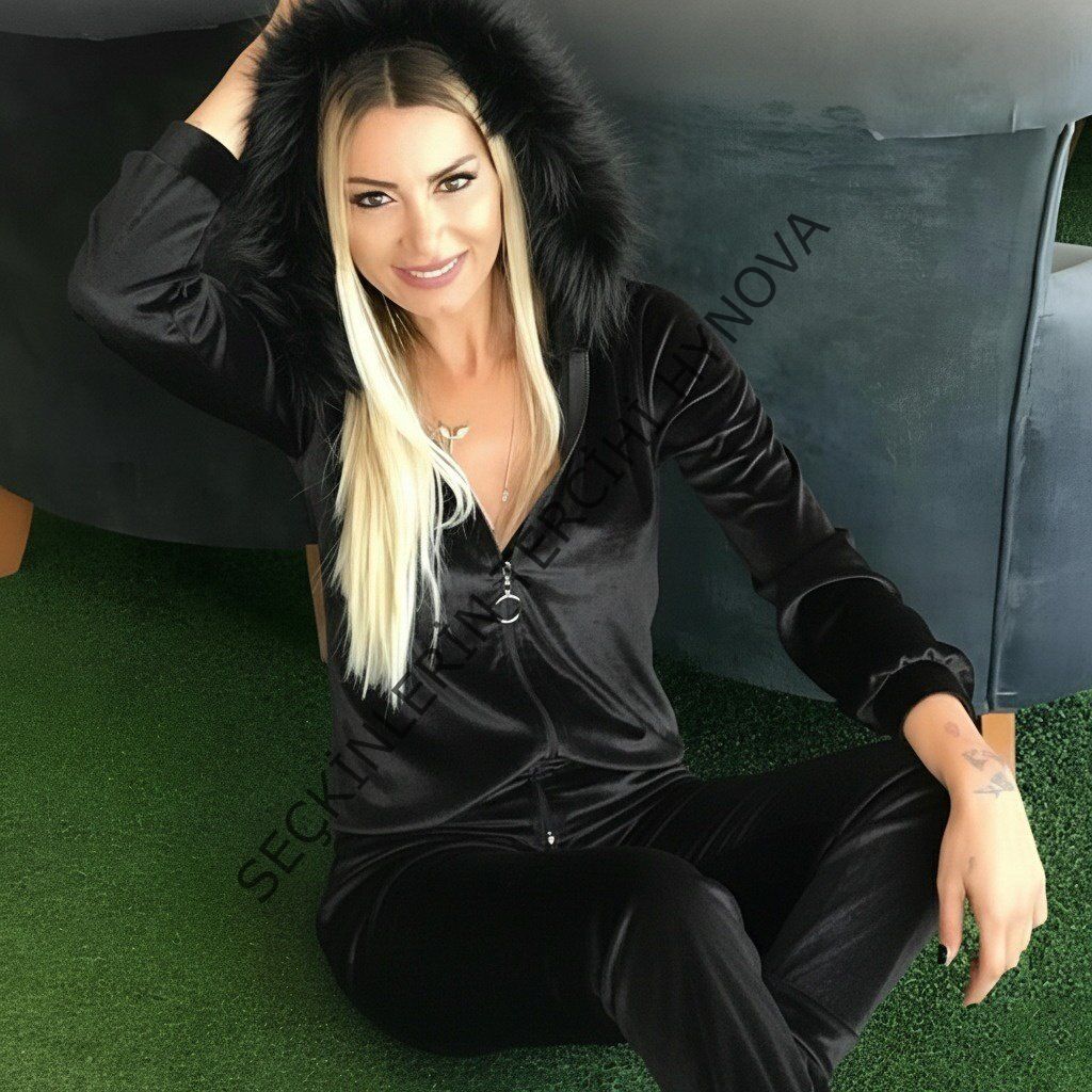 Kadın Uzun Kollu önden Fermuarlı Kapşon Tüy Detaylı Kadife Bluz Ve Pantolon Ikili Takım