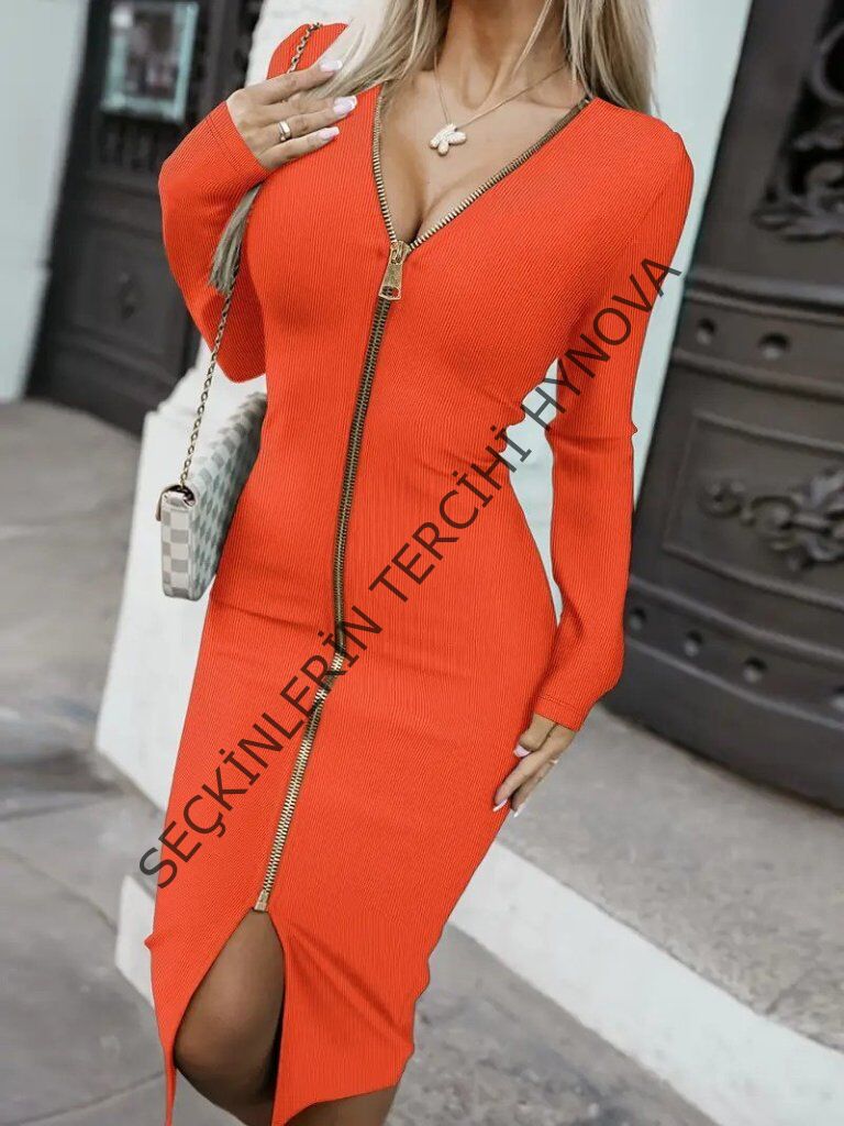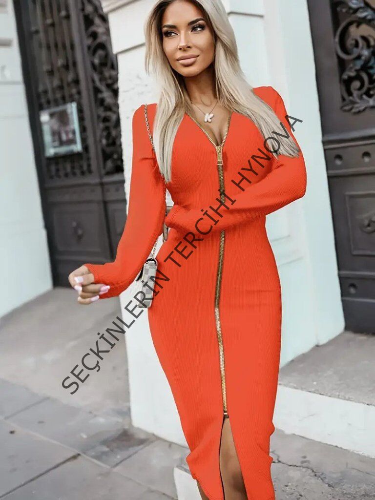 Kadın Uzun Kollu önden Fermuarlı Midi Ottoman Elbise