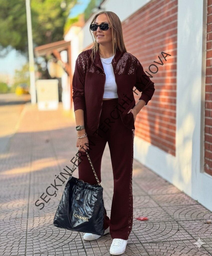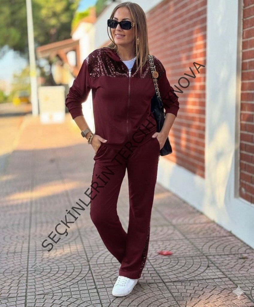 Kadın Uzun Kollu önden Fermuarlı Pul Payetli Alt üst Viskon Iki Iplik Takım