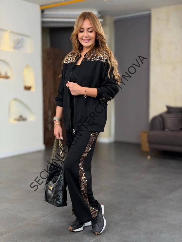 Kadın Uzun Kollu önden Fermuarlı Pulpayet Detaylı Bluz Ve Pantolon Ikili Takım