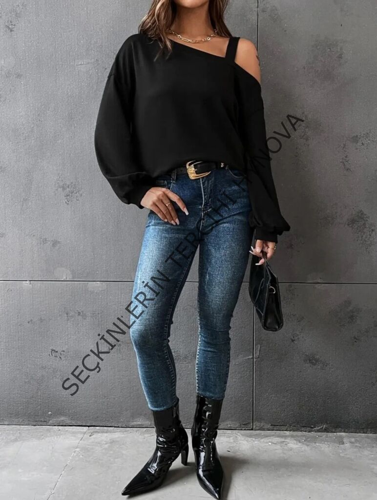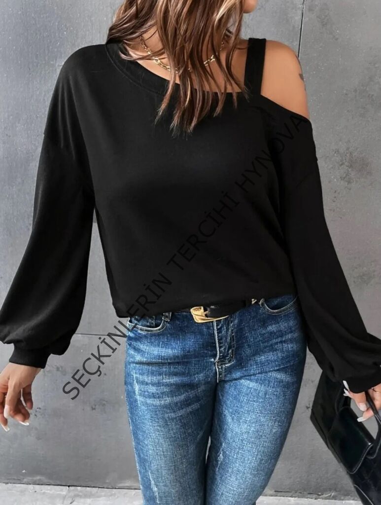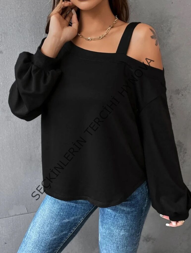 Kadın Uzun Kollu Tek Omuz Askı Detay Salaş Viskon Iki Iplik Bluz
