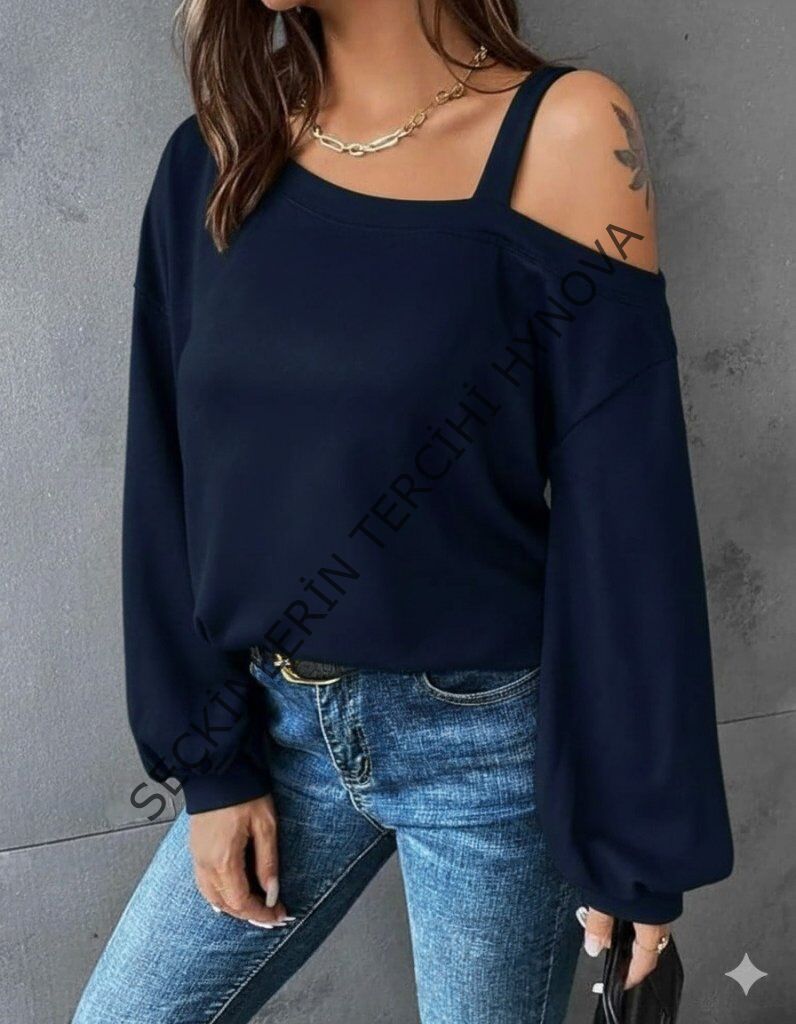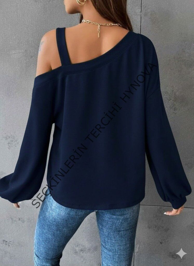 Kadın Uzun Kollu Tek Omuz Askı Detay Salaş Viskon Iki Iplik Bluz