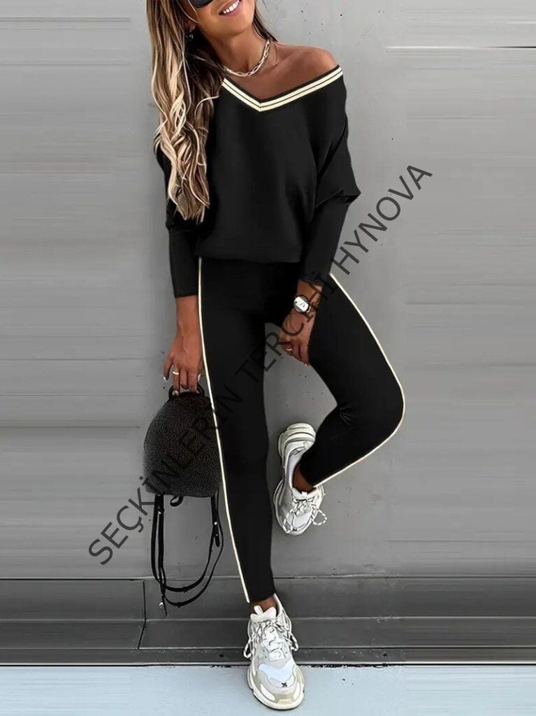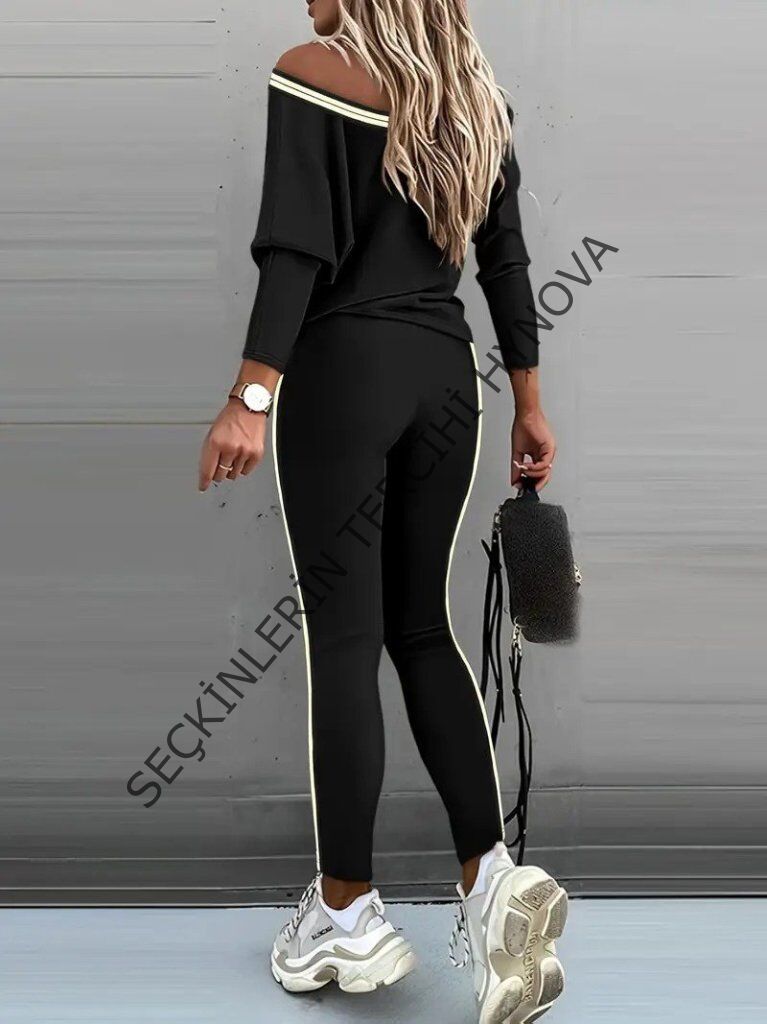 Kadın Uzun Kollu Tek Omuzu Açık Detaylı Viskon Iki Iplik Bluz Ve Pantolon Ikili Takım