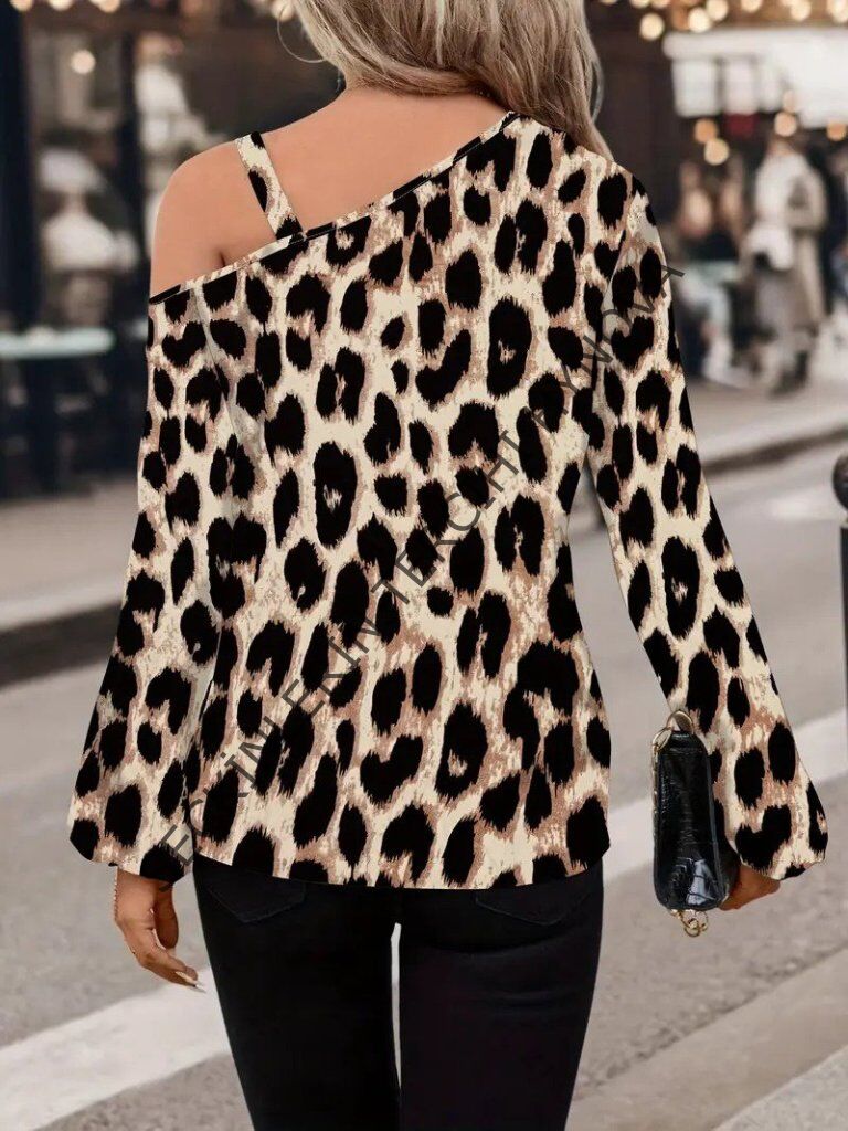 Kadın Uzun Kollu Tek Omuzu Açık Tokalı Leopar Desenli Modal Bluz