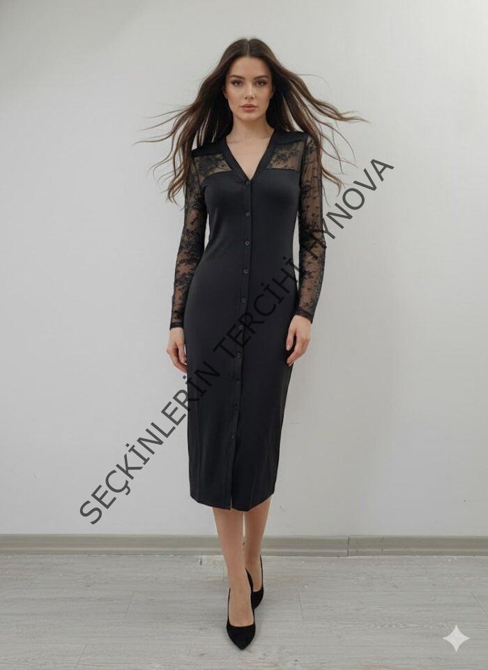 Kadın Uzun Kollu Transparan Detay Midi Boy Elbise