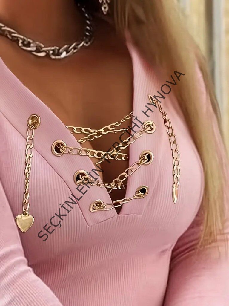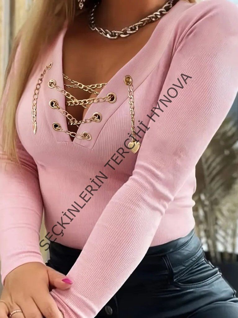 Kadın Uzun Kollu V çapraz Zincir Detaylı Kaşkorse Bluz