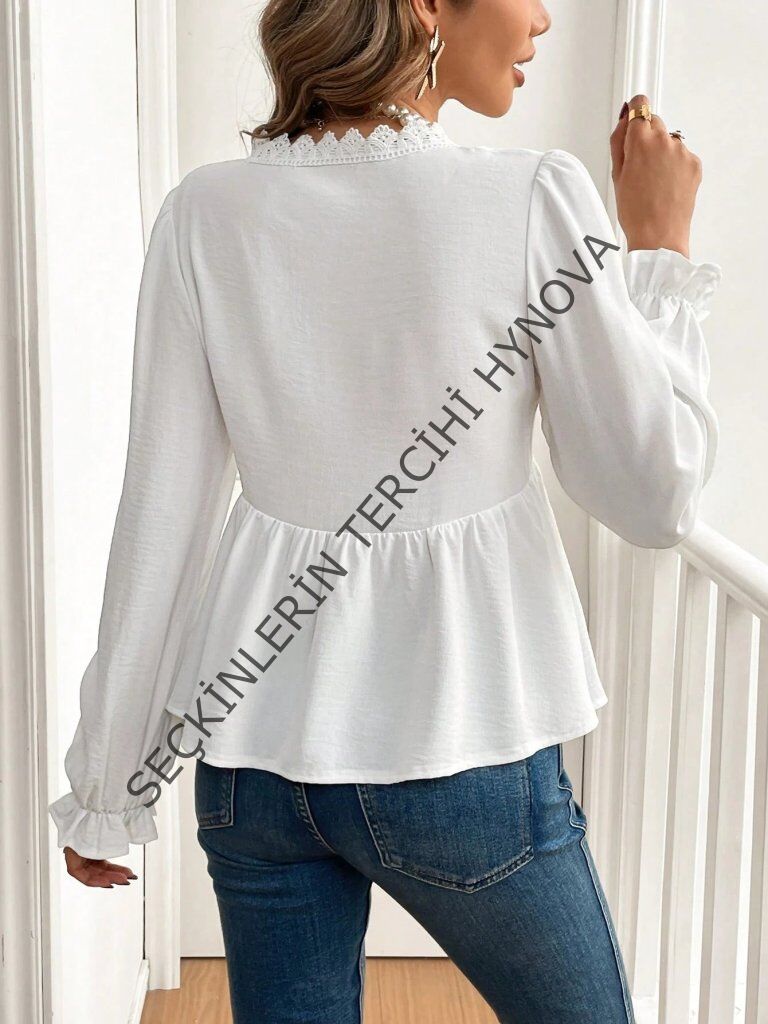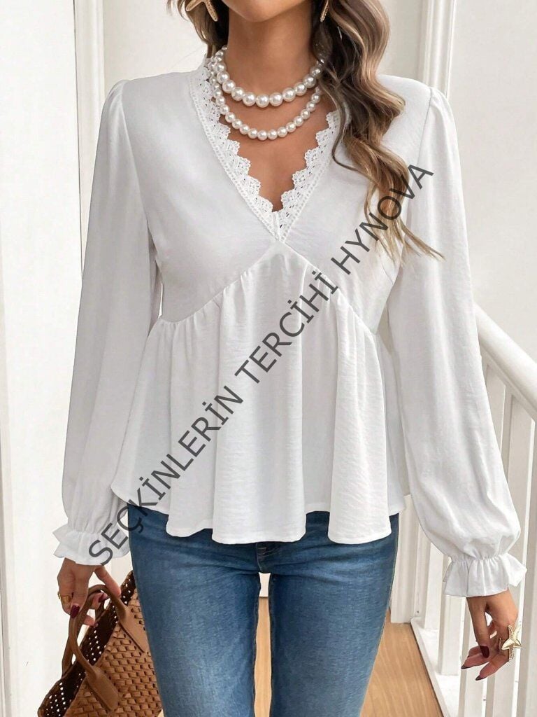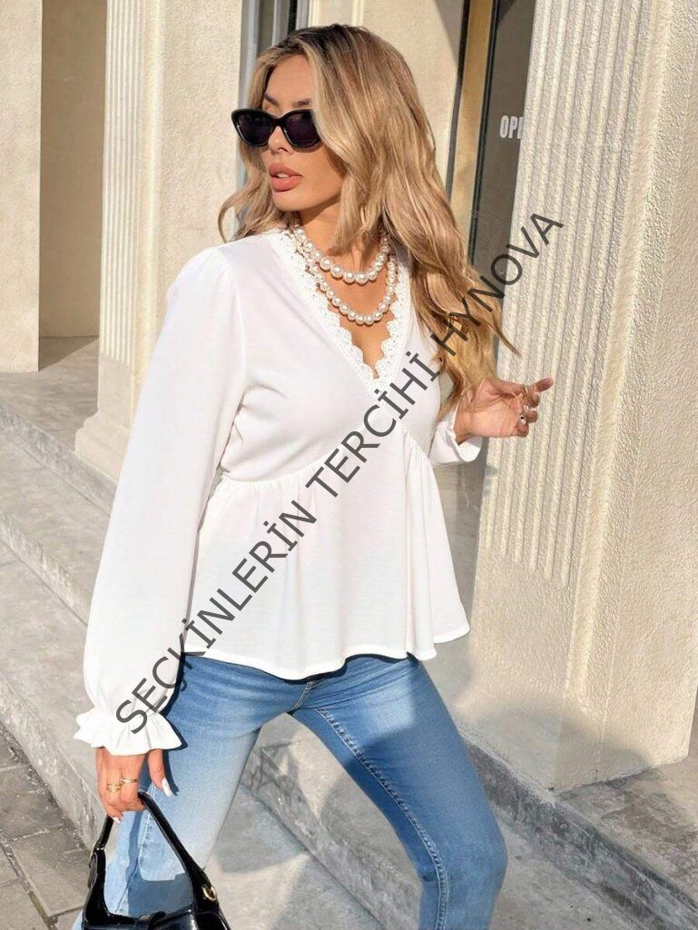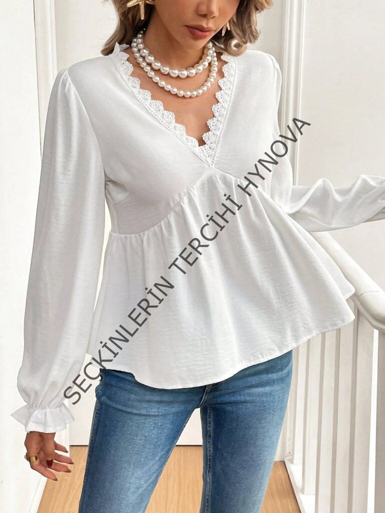 Kadın Uzun Kollu V Dantel Yaka Aerobin Bluz