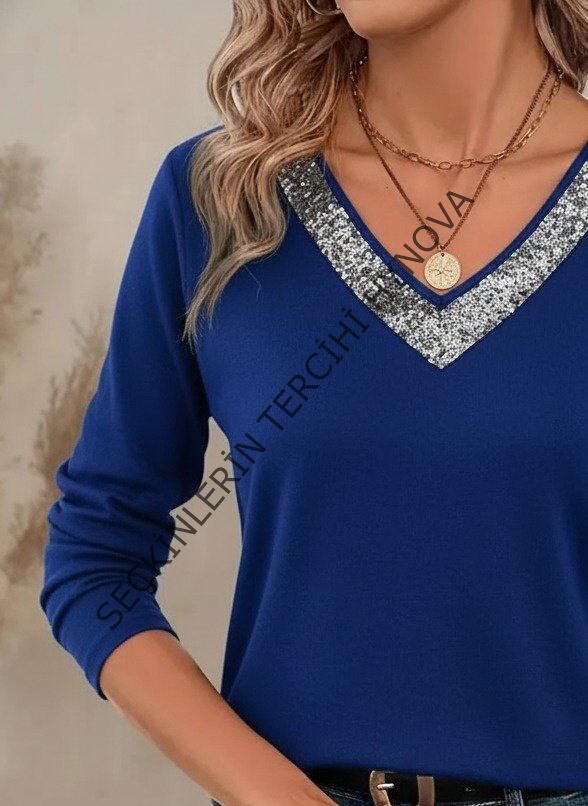 Kadın Uzun Kollu V Payet Yakalı Viskon Bluz