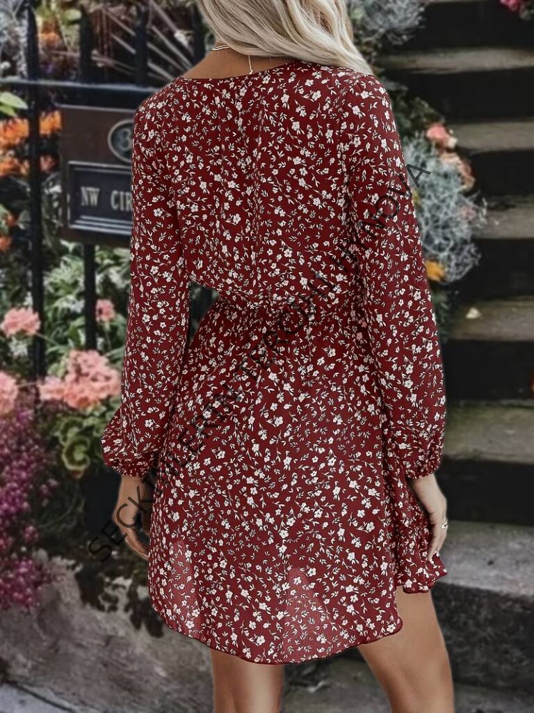 Kadın Uzun Kollu V Yaka Bağcıklı Belden Gipeli çiçek Baskılı Kısa Süprem Elbise