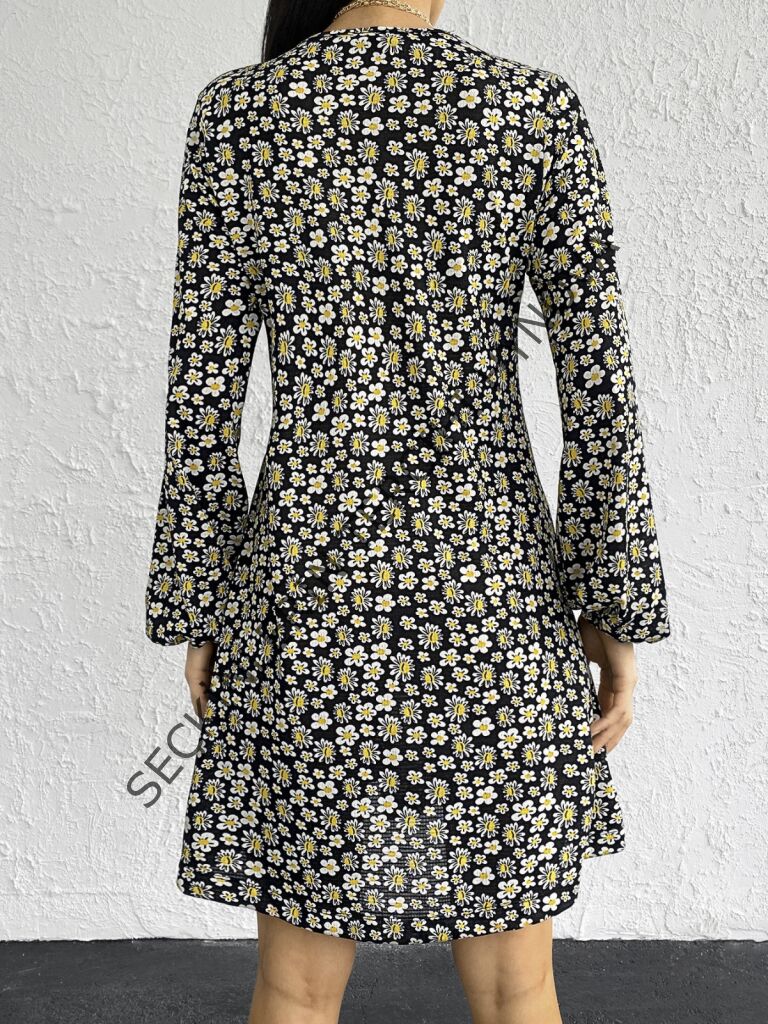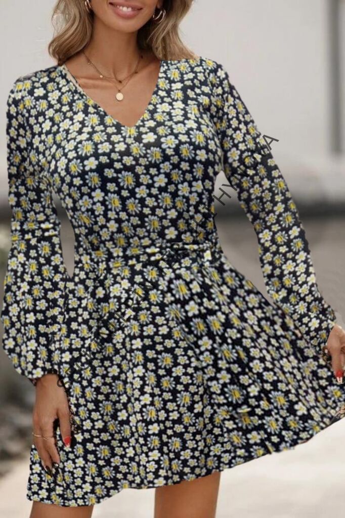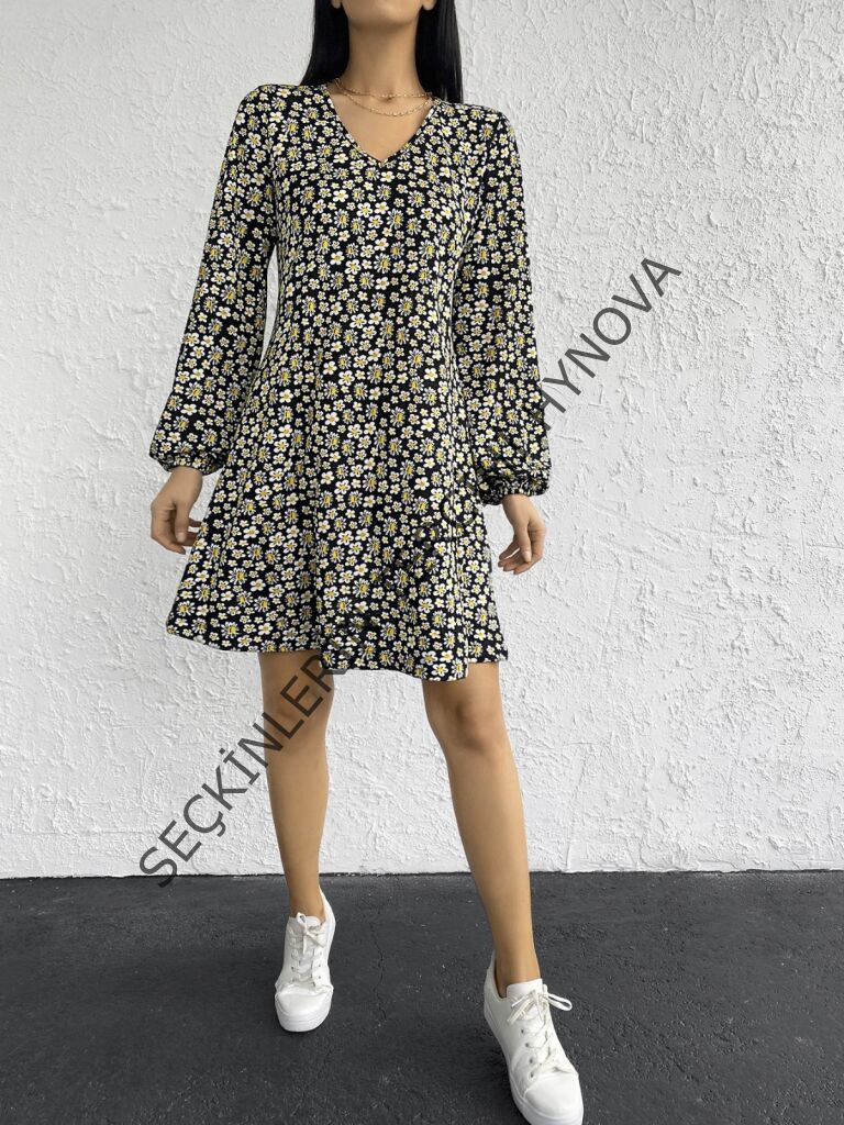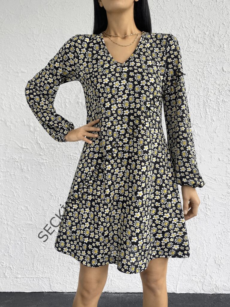 Kadın Uzun Kollu V Yaka çiçek Desenli Helen Kumaş Elbise