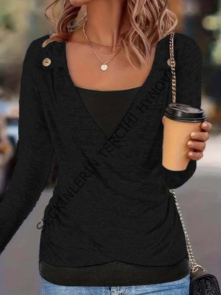 Kadın Uzun Kollu V Yaka Düğme Detaylı Yumoş Bluz